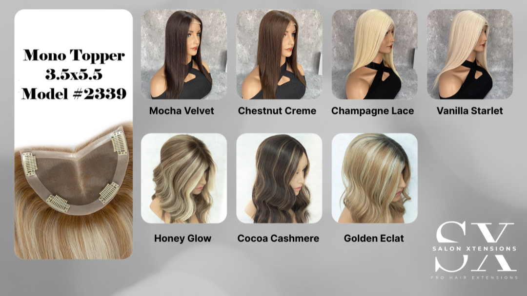Achieve natural-looking, discreet coverage with our 3.5"x5.5" Mono Topper Model #2339, part of The Isabella Collection. Crafted from Virgin Human Hair with the healthiest naturally aligned cuticles, this topper offers soft movement, natural shine, and long-lasting durability—lasting years with proper care.