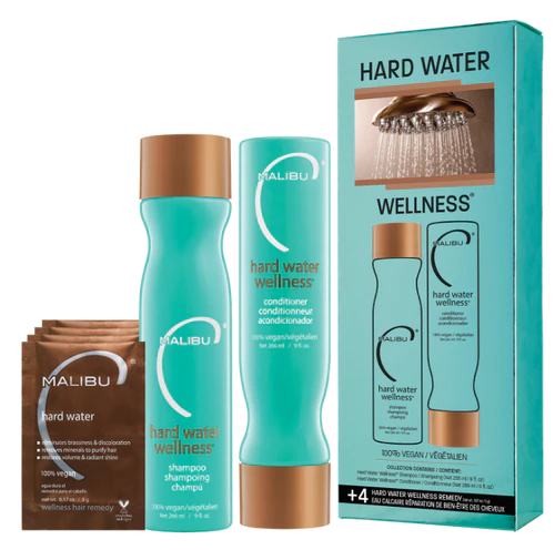 Regardless of texture, every client must use the Malibu C Hard Water Wellness System once per week. This includes the Malibu C Hard Water Wellness Shampoo, the brown Malibu C Crystallized Vitamin C Packets, and the Malibu C Hard Water Wellness Conditioner.